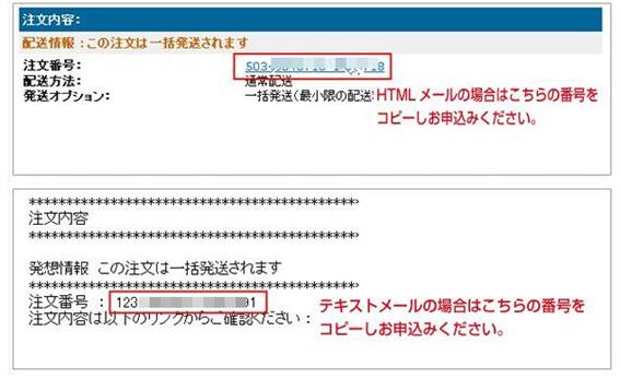 その後、Amazonから送られてくる「注文番号」「メール全文」を申請フォームにコピーし申込下さい。